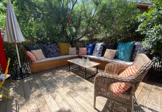Cette magnifique villa d'architecte, au pied des dunes, vous propose au rez de chaussée, une cuisine américaine ouverte sur un salon et une grande terrasse bois, 1 chambre double et une salle d'eau.